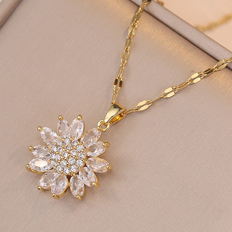Trendy Flower Stainless Steel Zirconia Pendant Necklaces For Women Girl Plant Metal Crystal Jewelry Party Birthday Daily Gold Color A – Sumsfashion